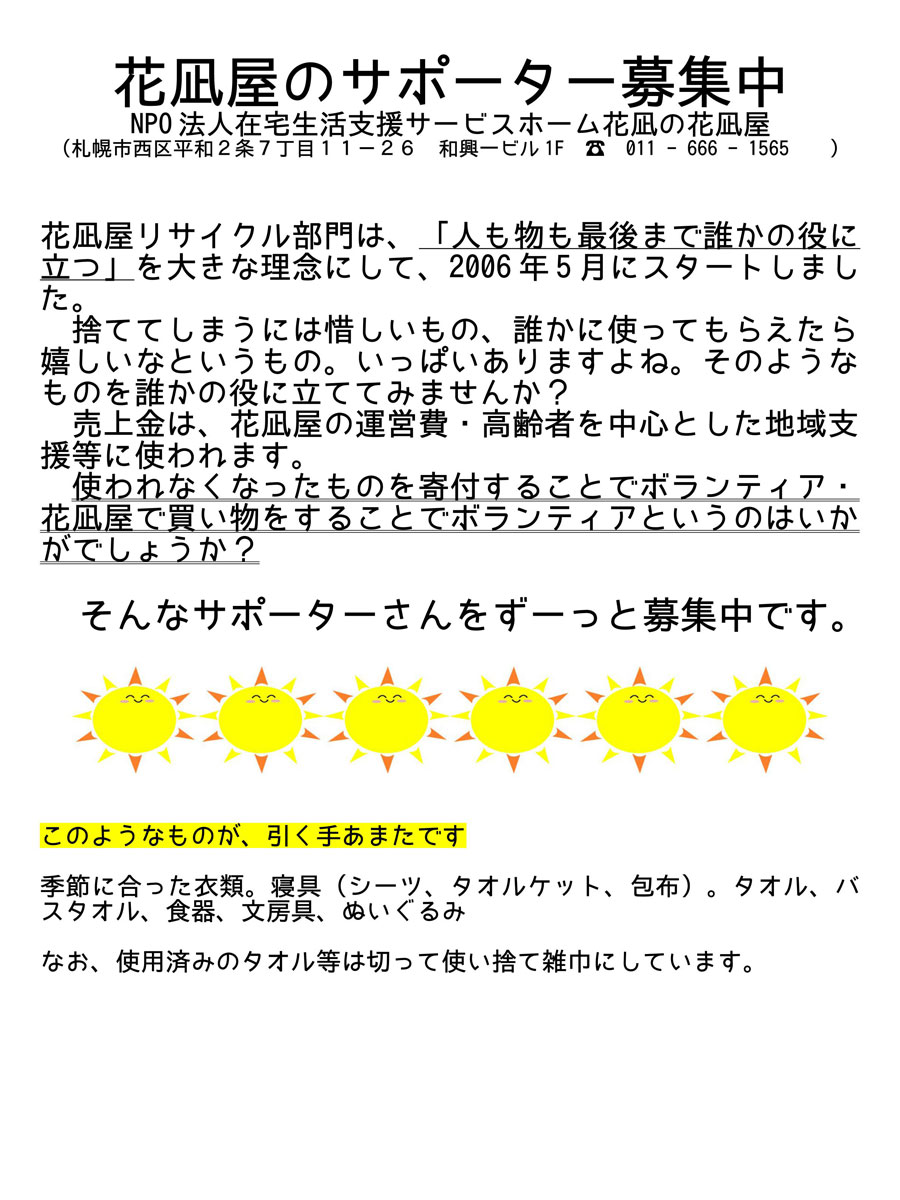 花凪では、FM三角山放送・土曜日の番組「リレーエッセイ」の一つとして「花凪アワー—人と人とがつながって」を放送している(2009年10月17日にスタート)。理事長がパーソナリティを務め、福祉というもの、暮らしというもの、地域というもの、それらに大事な人と人のつながりについて語っている。花凪とつながった人をゲストに招き、語り合っている。放送は毎月1回・第3土曜日で、午後3時から4時までの1時間。FM三角山放送の周波数は76・2。